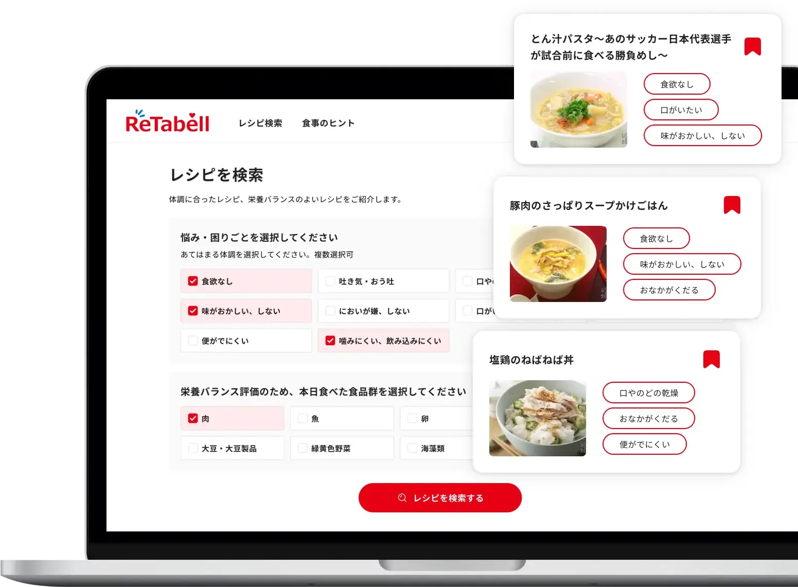摂食の悩み・栄養バランスに対応したレシピを3秒で検索できます。忙しい現場でも必要な情報にクイックにアクセス!