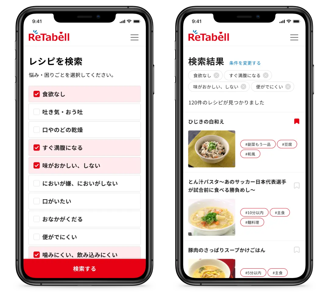 医療現場でよく相談される摂食の困りごと10種に対応した検索機能で、摂食の困りごとに対応したレシピに3秒でアクセスできます。